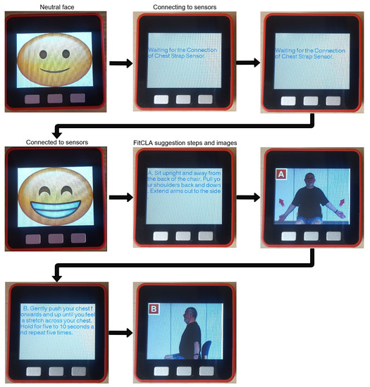 Figure 11 exemplifies the EMERALD operation flux. The assistant, when in standby, displays its face. Then, when the FitCLA prompts an exercise to the user, it first displays a text instruction of the exercise, accompanied by a voice explanation; then, it displays images explaining the correct body position used on the exercise (rightmost part of Figure 11). These images are presented to users that have a medium-to-high level of cognitive abilities and some motor skills. The exercises used were designed to be performed by elderly people without assistance of caregivers by the British National Health Security (NHS) [53], for which they are absolutely confident by being validated by medical experts. Nonetheless, we try to adjust the exercises to each user according to their physical limitations. Currently, due to hardware limitations, the bracelet is only able to play pre-recorded messages, but it has a sufficiently large memory to withstand all necessary voice instructions.