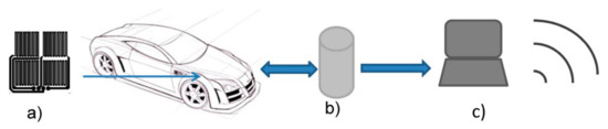 Schematic representation of the method of operation of a sensor for automotive corrosion measurements: (a) sensor unit, inserted in vehicle, (b) data logger, and (c) wireless data aquisition.