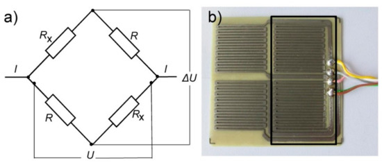 The electrical resistance (ER) sensors were made of high strength steel from a 250 µm thick foil. The 1 mm steel sheets were first chemically etched in order to obtain sensor elements of the form shown in Figure 2b. These sensor elements were then hot-glued onto a glass-fiber resin plate with a thickness of 0.7 mm. The four sensor elements were arranged in a Wheatstone bridge. Two of the sensor elements were exposed, whereas the other 2 sensor elements were protected by a transparent epoxy coating. The two dummy resistors (R in Figure 2a) were used for temperature effect compensation. The transparency is deliberate in order to control the state of protected sensors’ elements. The width of the electrical leads in the sensor elements is 0.7 mm.
