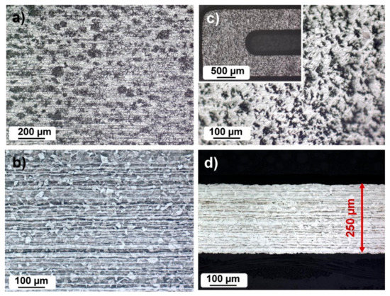 The microstructural properties of the as-received high strength steel and of the thinned steel sheet are presented in Figure 3. Both the as-received and thinned steel sheets are analyzed in a top view direction and in cross-section. The top view of the as-received high strength steel shows imperfections, rolling lines, and in general a non-homogeneous surface (Figure 3a). The orientation of the crystal grains is uniform in all directions, and the size of the crystal grains is 20–40 µm (Figure 3b). The microstructure of the steel sheet core is completely austenitic. In the core, the austenitic crystalline grains are smaller (Figure 3b) than in the vicinity of the surface. In some crystalline grains, twin boundaries are visible. The top view of the chemically etched surface of the high strength steel shows a relatively rough surface (Figure 3c). The cross-section of the thinned steel sheet is presented in Figure 3d. It can be seen that the microstructure remained unchanged after chemical etching for thinning purposes.