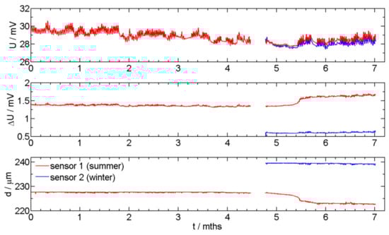 Two newly designed sensors were installed in a vehicle. The installation position is in the inner compartment of a vehicle that is designed from high strength steel. Sensor 1 was initially exposed in summer time (red curve), and sensor 2 was exposed 5 months later in winter time (blue curve). The aim was to monitor the thickness reduction, which is directly correlated to the corrosion rate. Figure 4 presents monitoring of U, ΔU, and thickness reduction of the readout data for sensors 1 and 2.