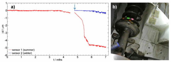 The values presented in Figure 4 are direct values without adjusting the thickness of the sensor to 250 µm. The first non-corroded sensor has an initial thickness of 228 µm, while the second sensor was initially 239 µm thick. Figure 5a presents the thickness reduction of the two sensors exposed to corrosive environment for two different exposure times. Figure 5b presents the position of the sensors. A filtering process was used in order to remove fluctuations of the recorded data. In the case of sensor 1, which was exposed in the summer time, different intensities of corrosion attack were observed. The steeper the inclination of the curve, the higher the corrosion rate. In the first 4 months of exposure of sensor 1, no visible thickness reduction was observed. In the 5th and 6th month, the winter days resulted is the use of deicing salts, and also a higher humidity was present, thereby thickness reduction is observed. In the last 5 weeks of exposure, out of the total 7 months of the presented exposure, extremely warm and dry days were recorded, which again resulted in a slower corrosion rate (Sensor 1, the red curve). The results of the sensor exposed in winter are also presented in Figure 5 by a blue curve. The start of exposure of sensor 2 is indicated by an arrow in Figure 5a. In the first month of exposure for sensor 2 (months 5 to 6 in Figure 5), the initiation period is present, where no thickness reduction is observed. A slight thickness reduction was observed at the end of the presented exposure.