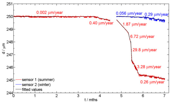 The average corrosion rates (in µm/year) at different time sections of the two sensors are presented in Figure 6. The thicknesses of the sensors were adjusted to a value of 250 µm so that both sensors could be compared. The sections of average corrosion rate estimation were chosen according to observe periods of changes in thickness reduction. In the case of sensor 1, which was exposed in summer time, it can be observed that during the first four months of exposure the corrosion rate was just above zero. After four months the corrosion rate increased slightly and it reached its highest rate at the beginning of the sixth month of exposure. The corrosion rate was close to 30 µm/year. Then, it slowed down and in the following dry and warm month it was again very low at 0.26 µm/year. In the case of sensor 2, which was exposed in the winter time, the corrosion rate during the last exposure time was 0.29 µm/year, since the environment at this time of the year is dry and warm. The measured corrosion rates, i.e., for sensors 1 and 2, were very similar, as expected. The different corrosion rates for the two sensors are expected (months between 5 and 6, Figure 6), since the initiation period for the start of the thickness reduction due to the corrosion process is different, due to different corrosion environments for the two sensors in summer and winter time, respectively.