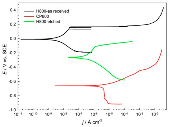 On the other hand, the corrosion potential Ecorr for the CP 800 steel is lower at −0.67 V, and the corrosion current density jcorr is higher at 4.71 µA/cm2. The CP800 material underwent active corrosion, since no passive region was observed in the anodic part of the potentiodynamic curve.