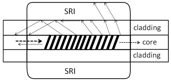 Figure 1). A large number of cladding modes result from the large size of the cladding. The cladding modes are strongly influenced by the surrounding medium. They propagate close to the border of the cladding; therefore, the SRI affects their effective refractive index. The cladding modes propagate in the opposite direction from the light propagation in the core. In the transmission spectrum, they are visible in the form of a fine comb. There are two other peaks in the transmission spectrum: the main core mode and the ghost mode. For SRI measurement, only cladding modes can be used. They are not visible in the reflection spectrum as a result of the high suppression of the modes in the fiber cladding. The individual cladding modes have a varied sensitivity to changes in external conditions. High-order cladding modes are more sensitive to changes in the SRI. The cladding modes exposed to increases in the SRI go into leaky modes, during which they do not reflect through the total internal reflection at the border of the fiber cladding and the surrounding refractive index. This means that their effective refractive index is larger than the surrounding refractive index.