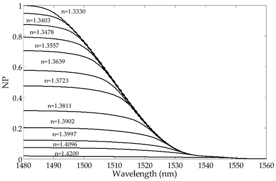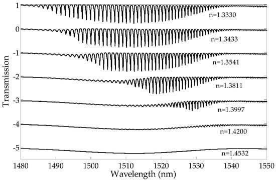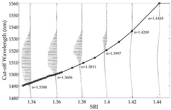 Figure 2, it can be observed that the amplitudes of the cladding modes for the shorter wavelengths are reduced first. The transmission intensity of the lower order modes does not change until the SRI reaches a certain value. For each resonance, there is an SRI value for which the mode is leaking from the optical fiber and its transmission peak intensity in the spectrum disappears. As a consequence, the transmission spectrum becomes smoothed out, and there are no visible peaks in the cladding modes. The cut-off wavelength is the wavelength after which a given mode is no longer propagated on the interface between the cladding and the surrounding media. The mode at the cut-off limit strongly shifts towards longer wavelengths while reducing its intensity. The leaking mode strongly reduces its intensity with a slight wavelength shift [