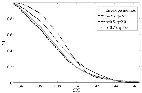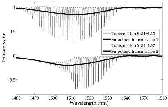 The moving average filter is the simplest of the finite impulse response filter. It is just the unweighted mean of previous samples for the causal filter. However, causal filters introduce a delay, which for the spectrum signal processing is manifested by its shift. Therefore, we ultimately use non-causal filters. These filters calculate the output signal based on past, current and future inputs. In principle, any filter that has smoothed cladding mode peaks is sufficient for this application. It is important that the filtered spectrum look similar to the spectrum measured for large SRIs, where all the modes have leaked from the structure outside the cladding. The subtraction of the local mean component from each point of the spectrum (Equation (5)) results in the removal of slowly changing components and leaves only the values related to the cladding modes resonances. Information about the SRI value is contained exactly in the changing shape of the individual peaks. The choice of p and q parameters of the UP algorithm (Equation (6)) allows algorithmic shaping of the sensor processing characteristics. The choice between algorithms and parameters can be based on the analysis of the linearity of the sensor processing characteristics. In our case, the nonlinearity is 8.6% for the mean deviation (MD), 7.8% for envelope, 7,1% for contour and 15.7% for SD in the 1.333–1.42 SRI range. The nonlinearity is 8.5% for MD, 9.2% for envelope, 7.7% for contour and 4.1% for the universal parameter (UP) (p = 0.75, q = 4/3) in the 1.333–1.4 SRI range.