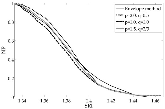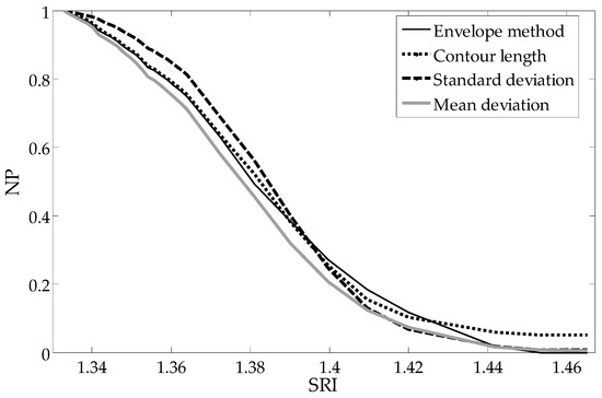 To compare the shapes of the dependence of particular parameters from the SRI, each parameter is normalized to one representing its maximum value (pure water SRI = 1.333). The most important advantages of such global methods are the linear characteristics in a large part of the measurement range, which results in more even sensitivity of the sensor. The reduction of sensitivity, as well as non-linearity, only occurs for the most extreme SRI values being measured. As can be seen in