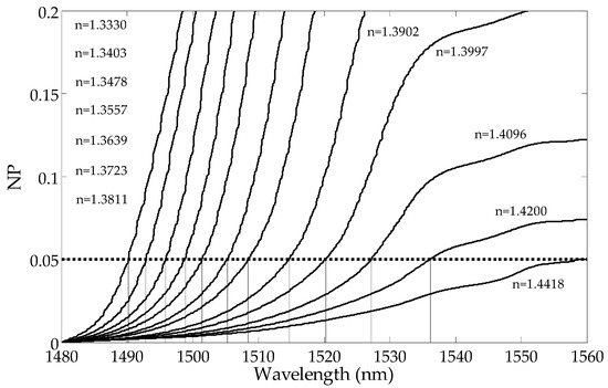Figure 7 and by finding a place at the wavelength of their intersection with a horizontal curve of 0.05, in the normalized parameter (NP) value (