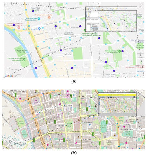 (a) Snapshot of QGIS with containers of plastic waste detailed; (b) Snapshot of Net2Plan-Geographical Information Systems (GIS) with containers of plastic waste plotted with green icons.
