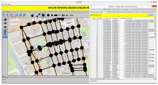 Snapshot of a delimited downtown area of Cartagena in Net2Plan, plotted with nodes and links in intersections and streets respectively. On the right side, the list of links is plotted, with length in km and attributes.
