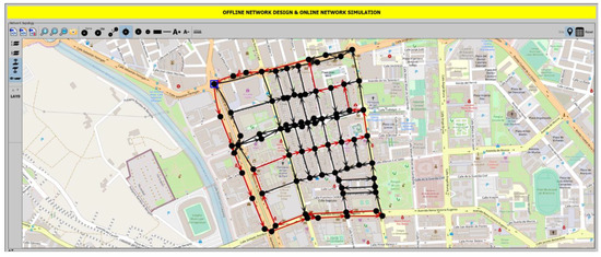 Note that the algorithm in Equation (1) takes into account street cuts and rearrangements of street directions since Net2Plan manages the sets E and E’ from the data processed by Net2Plan-GIS plugin, importing updated data from the GIS database of the city.