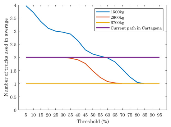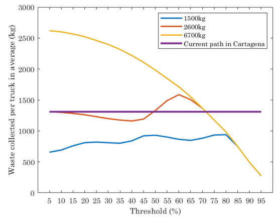 The results of the current path in Cartagena shows that the average of waste collected per truck is almost 1400 kg. The result of the optimal path for trucks with different capacities depends on the threshold set in the ILP execution and truck capacities. For trucks with low capacity (1500 kg and 2600 kg), the waste collected per truck is lower than the current path for almost all thresholds evaluated, while for trucks with 6700 kg of capacity, the waste collected strongly depends on the threshold. For threshold values from 5% to 70%, the average of waste collected per truck is higher than the result provided by the current path. When the threshold is higher than 70%, the amount of waste per truck in average is lower than the current path.