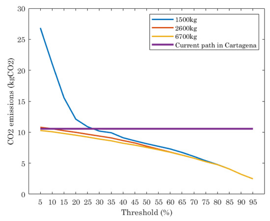 The number of trucks, the amount of waste they collect and the length of the routes are directly related to the CO2 emissions. This parameter was formulated in Section 5. Figure 6 shows the results of this in the scenario under study for the current path in Cartagena and the ILP executed for different truck capacities and thresholds. From Figure 6 we see that the current path has a constant value of CO2 emissions, since it is a fixed route with a fixed number of trucks, independently of the threshold value. The ILP shows that, depending on the threshold and truck capacity, the CO2 emissions varies. When trucks with 1500 kg of capacity are considered, the CO2 emissions are strongly dependent on the threshold. Threshold values in range [5%, 25%] means CO2 emissions higher than the current path. When threshold is set to 25% or lower the ILP reports lower CO2 emissions than the current path.