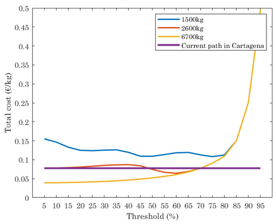 Finally, the total cost of waste collected (€/kg) is shown in Figure 7. This depends on the length of the paths computed (that impacts also CO2 emissions) and by the number of trucks used, with a fixed cost per truck (€100), which includes cost of truck maintenance and driver salary per day. First thing to note is that total cost is, in our case study, dominated by the fixed cost of the trucks, that have a much higher impact in the final cost than the route lengths. Results plotted in Figure 7 show that the current path has a constant cost, while the ILP reports higher cost when trucks with 1500 kg of capacity are assumed, since more trucks are needed. When trucks with 2500 kg of capacity are used, the cost is almost equal than the current path, independently of the threshold set. However, if the trucks have 6700 kg of capacity, the cost is lower than the current path when the threshold is set in the range [5%, 70%].