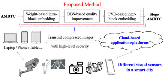 Conceptual framework and the application scenario which illustrate the usage of the proposed method. In a smart city, the proposed method can perform data-hiding and compression jointly to increase the security level of visual sensing data.