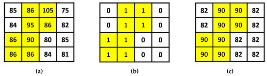 Illustration of the Absolute Moment Block Truncation Coding (AMBTC) compression. (a) Original image block, where the average pixel value = 86 using (1). (b) The bit map used in AMBTC, where NH = 8 and NL = 8. (c) The AMBTC compressed block, where BS = 4, HM = 90, and LM = 82.