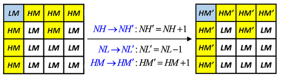 where () and () represent the high (low) mean values from the even-order block and the odd-order block, respectively. Sometimes, no candidate parameter pairs of block are found because of the constraints used. In this case, we compulsorily change the values of using the method shown in Figure 5. Note that, for the example shown in Figure 5, the value of is increased by 1; however, the hidden function value is unchanged (i.e., the secret data of the intra-block embedding are not damaged) because the values of are modified accordingly.