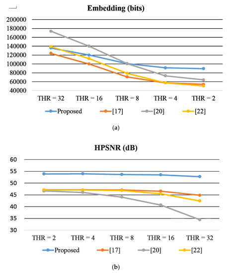 Comparison of the variation of the usage of different thresholds. (a) Results of data capacity. (b) Results of Human Vision System-based Peak Signal-to-Noise Ratio (HPSNR) value.