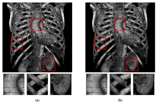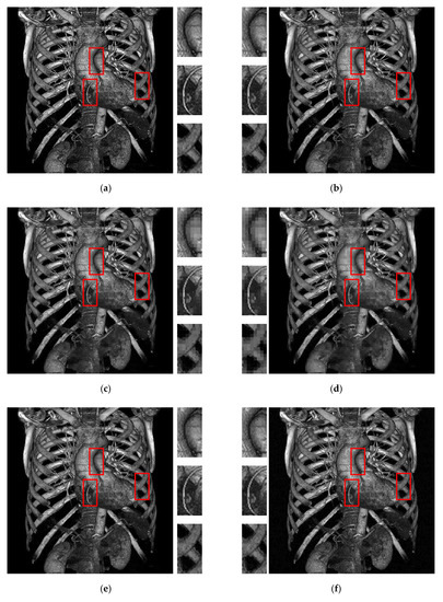 Figure 8 shows the visual comparison of different methods. In Figure 8, the threshold is set as 8 for all methods. Compared with the other methods, the proposed method exhibits clearer results in the central parts, and the color is closer to the original grayscale image. The rib area (the right red box) in Figure 8f shows that the proposed method preserves the required details of the original image. For the methods in [17,20,22], the presence of block effects is observed, particularly in Figure 8c,d because the data embedding is based on each AMBTC block. By contrast, in the proposed method, quality improvement phase successfully alleviates these unnatural effects.