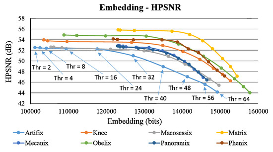 Figure 9 and Figure 10 show the self-evaluation results. Similar to Figure 7, the plot of embedding capacity versus image quality is analyzed. When the threshold is higher than 32, the overall capacity abruptly increases, and a considerable amount of secret data are embedded, which deteriorates image quality. Therefore, in both figures, the image quality curves obviously drop in the right side. However, for these eight test images, with the increasing capacity (under a larger threshold), the reduction in image quality is observed from to . We find that the declination in the curve is not evident within this range. This phenomenon occurs particularly in the images with more flat regions, such as Matrix, Panoramix, and Phenix. Figure 11 shows the results of the proposed method using the test image Phenix (with different threshold values).
