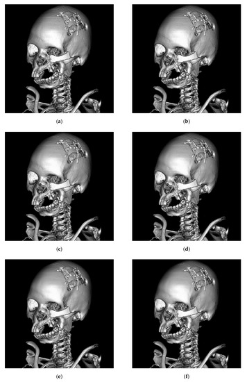 Results of the proposed method using the test image Phenix (with different threshold values). (a) Threshold = 2. (b) Threshold = 4. (c) Threshold = 8. (d) Threshold = 16. (e) Threshold = 24. (f) Threshold = 32. It can be seen in (e) and (f) that some artifacts occur in the hindbrain region.