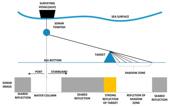 Side-Scan Sonar (SSS) has become one of the main underwater sensors which has a wide array of applications such as oceanographic surveys [], geological survey [] and searching for rescue []. The detection of topography and seabed target is realized by the SSS acoustic principle, we can regard the result presented as an image, which is the most intuitive way of visualizing information and has greater significance. Sonar sensor can be mounted on AUVs to quickly perform various ocean missions like path planning [] and navigation [,] by the semantic segmentation results of SSS images. Meanwhile, the real-time segmentation and autonomous recognition technology also promote the development of underwater intelligent devices. The SSS imaging principle is shown in Figure 1. By moving the AUV ahead, the seabed is scanned stripe by stripe, each scan line is recorded as one ping.