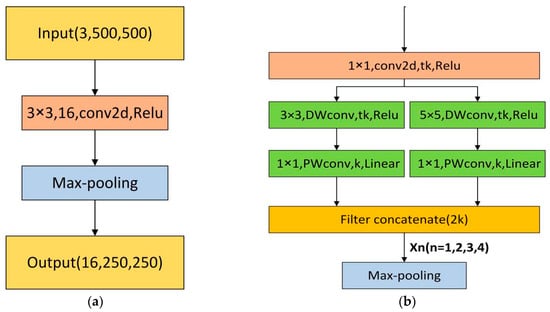 The initial single block of our network possesses a convolutional layer with 16 filters which adds up to 16 feature maps after convolution, then max-pooling performs to reduce the input size by half, that is presented in Figure 4a. The encoder block in our proposed architecture is based on the inverted residual block in MobileNet-V2 [] which is a light-weight network. Our novel encoder block is shown in Figure 4b.