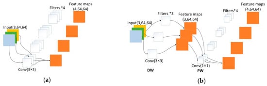 The left branch consists of 3 × 3 depth-wise (DW) convolution and the 1 × 1 point-wise (PW) convolution, also known as Depth-Wise Separable Convolution: The DW convolution is responsible for filtering the inputs channels, and the PW convolution is responsible for combining the results of the DW convolution. It separates the calculation of regions and channels into two steps while the standard convolution considers their calculation simultaneously. Many efficient neural networks [,] used the Depth-Wise Separable Convolution widely. We can intuitively see the difference between these two types of convolutions in Figure 5.