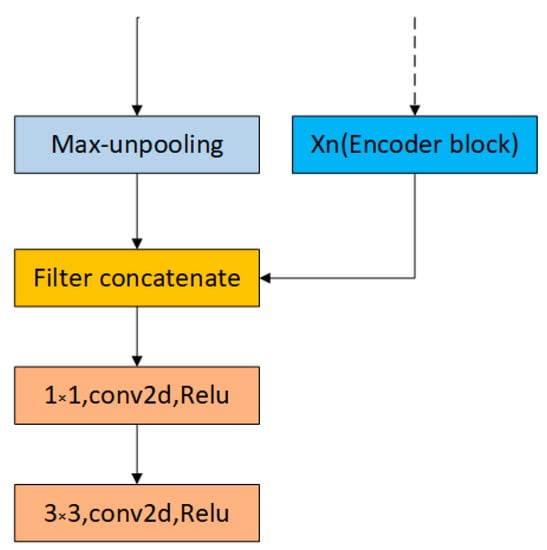 As shown in Figure 6, the input of our decoding block consists of two parts: One from the encoder information and the other upsamples its input feature map using the memorized max-pooling indices from the corresponding encoder feature map. The decoder combines the channels of these two parts instead of adding them.