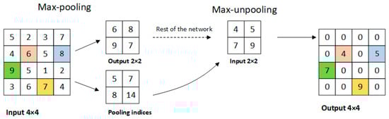 The last layer of the encoder block is the max-pooling layer with non-overlapping 2 × 2 windows, which downsamples the feature maps of the convolutional layer by calculating the maximum value of each window. The purpose is to retain key features while reducing parameters and calculations. We only store the max-pooling indices, the locations of the maximum feature value in each pooling window, and use it to upsample the feature maps for recovering spatial information. We will introduce the details in Section 3.2.