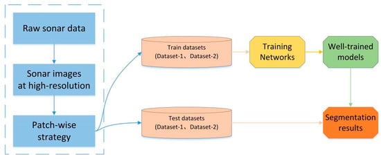 The overall experimental process is shown in Figure 8. We obtain the sonar data in XTF format from the sonar sensor mounted on an AUV, these data are stitching together in one single image after being parsed and then saved as a georeferenced grayscale image at high resolution. We collected sonar data from two locations, and then used the patch-wise strategy to divide the high-resolution sonar images into two datasets, one of which contains coral reef images (Dataset-1) from the South China Sea region, and the other one consists of sand wave images (Dataset-2) from Tuandao Bay in Qingdao, China.
