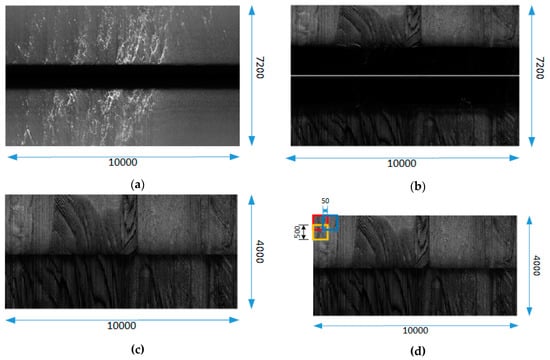 The high-resolution sonar images are shown in Figure 9a,b, where the average image size is 10,000 × 7200 pixels (after interpolation). The pixel values in the image are determined by the reflected strength of the echo and the distance from objects. The maximum pixel value is 255 as black color and the minimum value is 0 as white color. The black area in the middle of the image is a blind spot called water column, indicating that the sound wave propagates in the water. When the sound wave first reaches the sea floor and returns signal, the black area disappears and the seafloor echo signal begins to appear in the image. The proportion of the black area in the sonar image depends on the height of the sonar sensor from the sea floor. Since it interferes with our SSS image segmentation, we need to remove the water column area from the image as shown in Figure 9c.