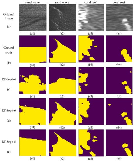 The segmentation results of SSS images, in which the first two columns are sand wave images from Dataset-1, the last two are coral reef images from Dataset-2. (a) original SSS image with a size of 500 × 500; (b) ground truth; (c–e) the segmentation results of RT-Seg-t-4, RT-Seg-t-6 and RT-Seg-t-8, respectively.