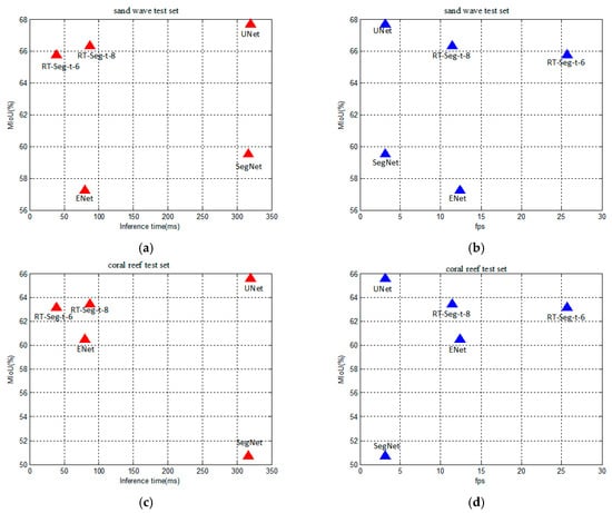 Figure 11 shows the trade-off between accuracy and speed at resolution of 500 × 500. The UNet has the advantage of accuracy, but its inference time for a single image input is much longer than other networks as shown in Figure 11a,c. We can also clearly see that the number of frames that RT-Seg-t-6 can be processed per second is much more than for RT-Seg-t-8. Meanwhile, there is no significant accuracy drop for RT-Seg-t-6 as shown in Figure 11b,d. However, during the testing of SSS image datasets, SegNet and ENet have no obvious advantages, neither in terms of accuracy nor speed.