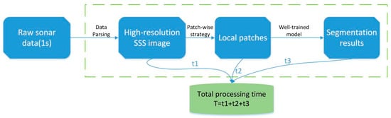 We will receive 60 pings sonar data per second from the sonar sensor. The time t1 for parsing the raw sonar data is about 0.2 s. When the slant range is set to 120 m (the maximum range), there are 7200 samples per ping, which corresponds to 7200 pixels. We got an SSS image of 60*7200 pixels after data parsing. Then we interpolate it to 500*7200. In total, we will get an SSS image with 500 × 7200 pixels per second. The interpolation time is completed by a CUDA parallel programming, so this time can be ignored. We use a patching strategy to split the high-resolution sonar image into 500*500 size of 15 local patches for 0.1s. In Table 4, we can see that the inference time of RT-Seg-t-6 for a single input of 500*500 pixels is 38.9 ms. The total inference time t3 for 15 images is 0.583 s. The total processing time of sonar data is 0.883 s, which means that the semantic segmentation of sonar data takes less time than the arrival of new sonar data to process.