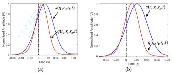 The L2’s time reversed signals from the two sensors are shown in Figure 10. As shown in Figure 10, at the observation points, the time reversed signals from the two sensors are slowly far from each other, with the increase of the distance between the observation point and the leakage point. At the point of intersection of two waveform curves, the amplitudes of the signals attenuate slowly. Therefore, the maximum signal amplitude of the traditional time reversal localization algorithm at the points close to the leakage position slowly decreases. The waveforms of and at various are shown in Figure 11. Since Equation (7) enlarges the phase of the output signal, the waveform of is further away from the reference time t = 0, as compared to the waveform of . Furthermore, at t = 0, the amplitude of is lower than that of . Therefore, the localization functional values of the proposed algorithm attenuate fast.