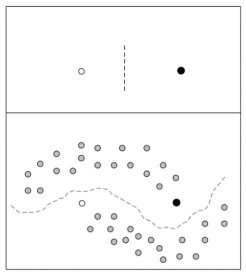 In unsupervised learning, fake data and real data are taken into the D for the optimization of the D to discriminate real and fake data. For the fake data generated by G, the D tries to judge it as fake data. For the real unlabeled data, the D tries to judge it as real data. In semi-supervised GAN, the real data usually consists of labeled data and unlabeled data. Here we need to explain the importance of unlabeled data in semi-supervised learning, as depicted in Figure 2. White and black dots in Figure 2 are different classificatory labeled data, and gray dots are unlabeled data. This figure intuitively conveys the importance of unlabeled data in semi-supervised learning when labeled data are rare.