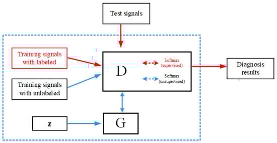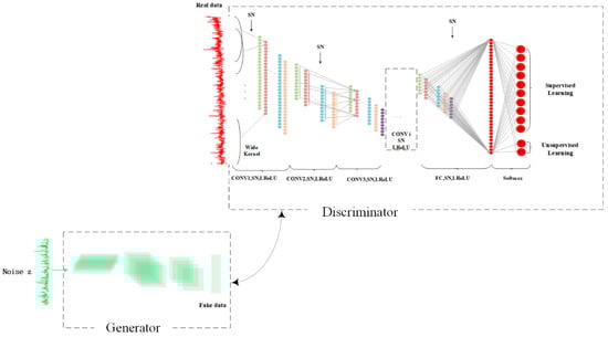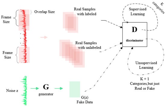 Due to the growth in the maturity of the GAN network [,], it has been applied to different fields. In the spur of generator, the discriminator can not only learn intrinsic, potential characteristics, but also can discriminate samples. In 2016, [] proposed the application of GAN for semi-supervised learning (SSGAN). The intuition exploits the samples generated by G in GAN to boost the performance of image classification tasks by improving generalization. The design of the basic GAN is also not the same for different research backgrounds. This paper is mainly aimed at learning the bearing signal vibration latent features and identifying the bearing vibration signal fault categories in real time to obtain the bearing health status information.