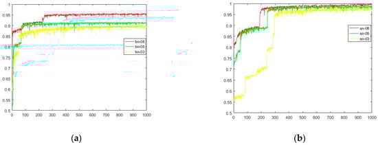 The result of BN-SSGAN and SN-SSGAN on the test data set and the training data set are shown in Figure 6. The unit of the horizontal axis is 1000. There are four sub-graphs, which are listed as: (a) The results of BN-SSGAN under three different ratio conditions of labeled samples in all training samples, which are 0.3, 0.5 and 0.8, respectively; (b) The results of SN-SSGAN under three different radios conditions of labeled samples in all training samples, which are 0.3, 0.5 and 0.8 respectively; (c) The accuracy of BN-SSGAN under training data set; and (d) The accuracy of the SN-SSGAN under training data set.