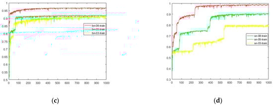 From Figure 6a, it can be seen that the accuracy is only 0.95 when the ratio of labeled data in training data is 0.8. However, it can be seen from (b) that when there is a label data ratio of 0.3, the accuracy is already greater than 0.95. When it is 0.5 and 0.8, the results are very similar, that is, the label data of 0.5 can achieve a result of 0.8, this indicates that SSGAN reduces the dependence on labeled data. (c) and (d) are the corresponding accuracy rates of (a) and (b) on the training set, respectively. We find that (a) and (c) are almost similar, and the accuracy of (b) in the same iteration is higher than (d), which means that SSGAN has better generalization ability. With regard to the variance in accuracy, we found that SN-SSGAN is slightly better than BN-SSGAN.