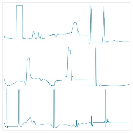 The above reports all the results of the experiment, the following provides some visualization regarding fake data. For a naive generative model, researchers pay more attention to the quality of the generated data. For a discriminative model, researchers pay more attention to the discriminating ability of the model. Obviously, this paper belongs to the latter. Although for the former, when the training is over, the D or classifier will be discarded, and this paper only pays attention to promoting the training of the D with the help of the G, the visualization of fake data is still given, as shown in Figure 7, where there are 9 sub-graphs that show all of the fake data generated by G. The length of fake data is 2048. The first impression is similar to the time/frequency domain features processed by transformation of the time/frequency domain from raw vibration signals.