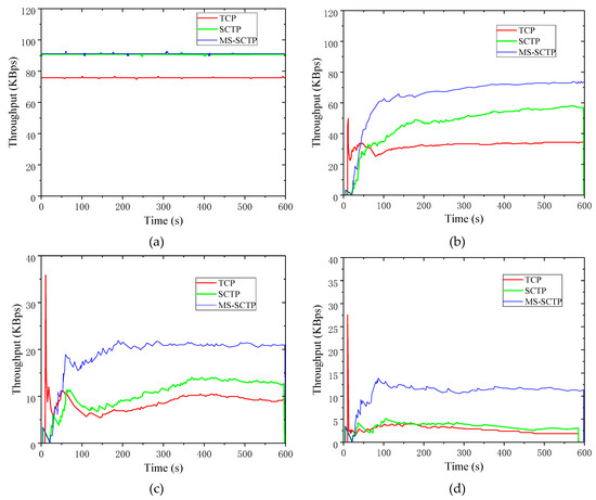 In simulations, the same simulation scenario was used as 3.1, and the PERs were 0%, 10%, 20%, 30%, 40%, and 50%. The metrics throughput and packet loss rates of TCP, SCTP, and MS-SCTP were used in the simulations to analyze the advantages of MS-SCTP. Figure 7 shows the real-time throughput of the three schemes when the PER changed from 0% to 50%.