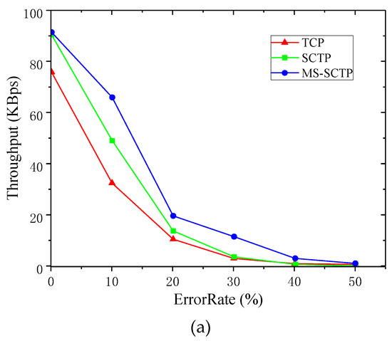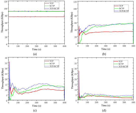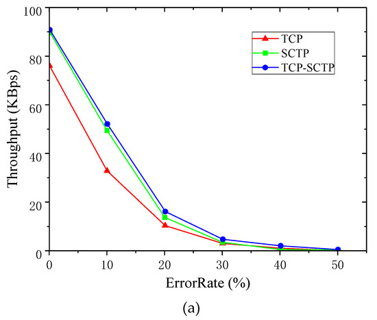 Figure 3a shows when the PER was zero, the throughputs of SCTP and TCP were 90 KBps and 77 KBps separately during the 600 s simulation time. The real-time throughput of SCTP was greater than TCP. In Figure 3f, when the PER was 50%, the throughputs of TCP and SCTP were both less than 4 KBps, and the throughput of the SCTP was always higher than TCP during the simulation time. When the PER was 10%, the average throughput of SCTP was 50 KBps, while the average throughput of TCP was 30 KBps in Figure 3c. On the whole, the real-time throughput of SCTP was higher than TCP. However, with the increment of PER, the advantages of SCTP became smaller. In Figure 3e, when the PER reached 40%, the throughputs of SCTP and TCP were close to zero. When the data PER was higher than 10%, the real-time throughput of TCP showed a significant trend of increasing at the beginning of data transmission in Figure 3. Moreover, the real-time throughput of TCP was much larger than SCTP, which could be explained by the connection mechanism of TCP and SCTP. SCTP required four handshakes to establish a coupling when establishing a connection. However, TCP required only three handshakes to establish a connection. The connection process of SCTP was more complex and took more time than TCP, therefore TCP had a higher throughput than SCTP when data started to transmit.