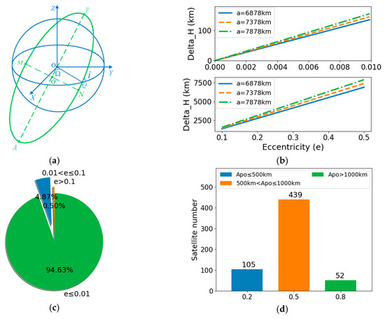 Analysis and statistical results of observation satellite orbit. (a) Satellite orbital parameters description; (b) Variation of altitude difference with eccentricity when semi-major axis is given; (c) Eccentricity statistical results; (d) Apogee altitude statistical results.