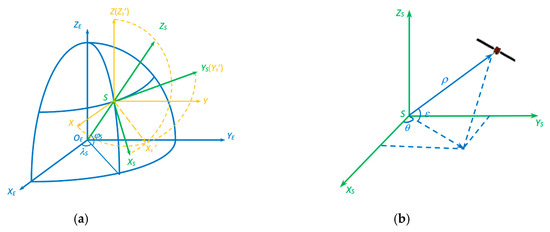 Set the coordinates of satellite target in the radar polar coordinate system to , where is the slant distance from satellite to radar station. represent the radar observation azimuth and elevation angle, respectively. These parameters could be obtained in the process of radar measurement. Then, the coordinates of the satellite in the radar body Cartesian coordinate system could be calculated by the following formula: