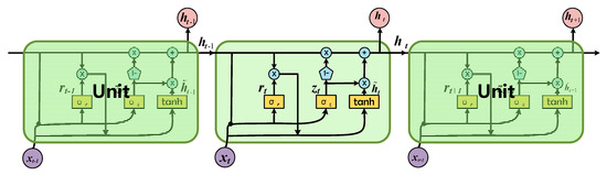 As mentioned above, GRU is designed in [37,45] to learn long term reliance on sequential data, and its overall performance is better than LSTM and simple conventional RNN [39,40]. Figure 5 shows a GRU model. There are only two gates in a GRU, namely the update gate and the reset gate . The update gate is utilized to modulate the previous information inside the unit. The larger the value of update gate, the more the status information of the previous moment insides. The reset door is used to control how much previous state information will be forgotten. The smaller the value of the reset gate, the more the previous state information is forgotten.