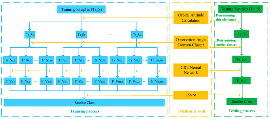 After the analysis and description of Section 2 and Section 3, the overall framework of this proposed satellite target recognition method is shown in Figure 7. It can be divided into three parts, namely training process, testing process and the methods and techniques used therein. Orbital altitude calculation and observation angular domain segmentation are applied to divide HRRP data, including training samples and testing samples. The detailed orbital altitude calculation process is shown in the Appendix A. On this foundation, GRU neural network is trained to get the deep abstract features based on divided HRRP training data. Then, the classification results of testing data could be obtained by the trained GRU neural network and LSVM.