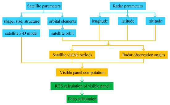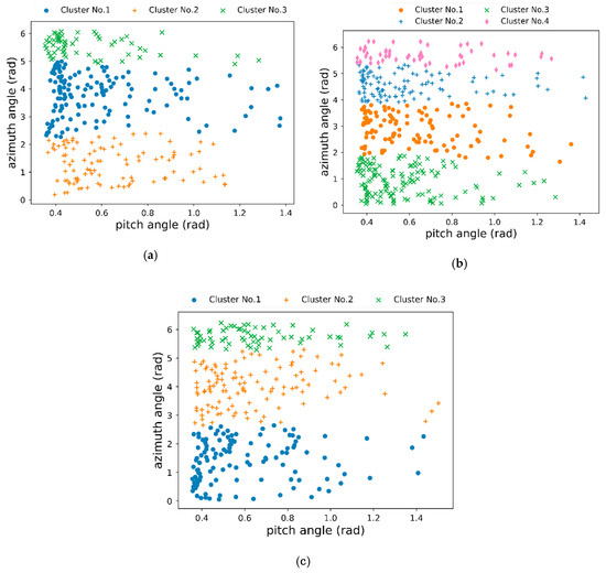 Considering the difficulty of obtaining satellite HRRP measured data, we utilize reliable simulation radar HRRP data from ten satellites that simulated by an X-band radar with a center frequency of 10 GHZ and a bandwidth of 1 GHz. The main parameters of radar and these satellites are listed in Table 2 and the detailed flow chart of radar data generation is shown in Figure 8. The observational relationship between satellite and radar is calculated based on their parameters. Then, radar cross section (RCS) and echo are computed and radar data is obtained. In our experiments, each satellite target has 70,000 HRRP samples and each HRPP is a 300-dimensional vector. The data preprocessing operation has been done as described in Section 2.1. 80% of radar data will be applied as training set and others as testing set. For training set, data partition would be done by orbital altitude calculation and observation angular domain segmentation. Figure 9 shows the data partition results. The orbital altitude of this ten satellites is divided into three ranges in this paper, namely , and . Meanwhile, a hierarchical clustering method with a novel NADDCC distance metric has been implemented for HRRP data in each orbital altitude range to get clustering datasets. It should be noted that a set of radar observation angles is shared by continuous 700 radar HRRP data. Thus, we could be decide which cluster the test data belongs to when determining its altitude range and angles cluster.