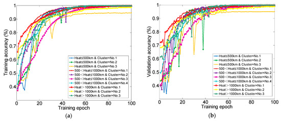 After completing radar data partition and GRU neural network training, a series of trained neural network models can be obtained based on training datasets of different clusters. According to the overall recognition framework in Figure 7, the orbital altitude calculation and observation angles assignment of testing data will be carried out, which is for determining which training model to extract their deep abstract features. Then, classification testing would be implemented by LSVM based on these features and corresponding recognition results of testing data could be gotten. The confusion matrices of these data tested by all training models are shown in Figure 11 and the corresponding recognition accuracy are listed in Table 3. It can be seen that testing data could be correctly divided into its corresponding trained model by orbital altitude calculation and observation angles assignment. Meanwhile, these ten satellites can be well recognized and achieve a total accuracy of 99.2%.